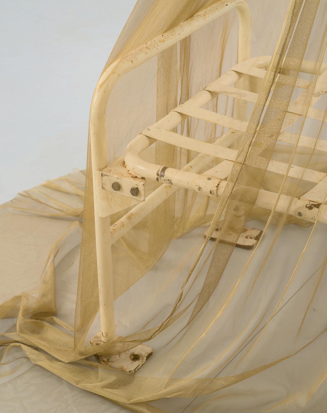 Gold is heavy, but this draped filter feels gossamer-light. Gathered on a circular ring, suspended from up high, it falls in folds and fragile waves to create a golden haze through which light and air can pass. Made to enclose a bodily space, to shroud and shield its supine occupant, the transparent mesh of Weight (2016) is both a protective membrane and a porous screen that reveals and obscures its contents. Through its lace-like weave, a bare bunk is visible, its geometry and basic frame providing the border and edge of the piece. Made to support a man, it is stripped here to its horizontal essence, a minimal, even measly bed that offers little comfort or care.