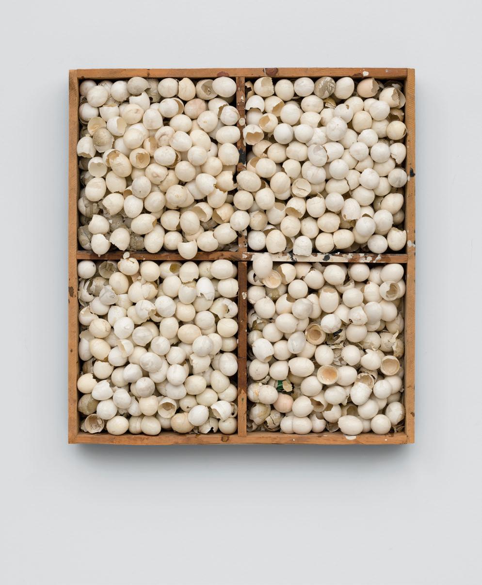The gold is crucial here. Its connotations are both symbolic and material. Not just tinted or superficially colored, the net of Weight is plated in 24 karat gold, a material freighted with preciousness and precedent. From the flattened grounds of gold-leaf medieval altarpieces to the golden modernist monochromes of Yves Klein and the battered fabrics of David Hammons, not to mention the hanging beads and baubles of Félix González-Torres, the capacity of gold to signify as both matter and metaphor is manifest. Its power lies in its aura as substance, suggesting riches and wealth, status and transcendence, at the same time as it is materially culled from the depths of the earth and must be sourced and transformed by labor and craft. It is both literal and abstract, a substance and a substrate on which the flow of capital is based.