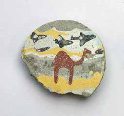 Her concrete jewelry displays many images, but the pieces with camels are a clever adaptation of a well-known tourist giftâa bottle into which different colors of sand are ingeniously poured to render the animal in its desert landscape. Using a process akin to that of terrazzo floor tiles, Vered has made brooches and bracelets showing camels and palm trees with cement, pigment, and sand from the Negev Desert.