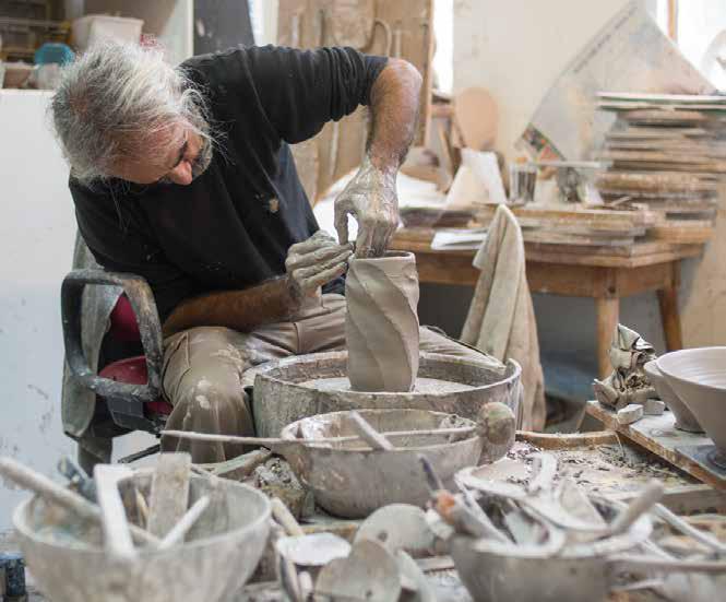 His gallery is just steps from his kiln, and there one can find graceful bowls, irregularly shaped boxes, eggs, jars, plates, teapots and cups, works on three legs that he terms tripods, vases, and vessels. Some of his works are large, and these he makes in sections, using coiling and then the wheel.