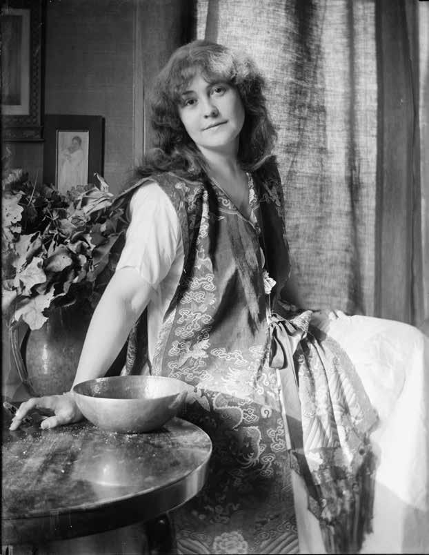 Käsebier brought an artist’s sensitivity to portraiture that was uncommon during her time. She encouraged a natural pose for Rose O’Neill, who smiles comfortably at the viewer, surrounded by simple objects of beauty—a bowl, a pitcher containing foliage, and a framed photograph. Active in the women’s suffrage movement, Rose O’Neill was an American cartoonist, illustrator, artist, and writer. She earned a fortune by creating Kewpie, a brand of dolls that appeared as baby cupid characters. O’Neill would become the best-known and highest-paid female commercial illustrator in the United States.