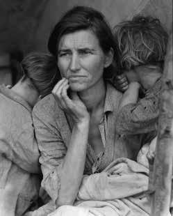 Lange took this photograph while employed by the United States Farm Security Administration, formed during the Great Depression to raise awareness and provide aid to impoverished farmers. At the center of this portrait is a mother’s worried face. On either side of her are two young children who turn away from the camera and rest their weary heads on her shoulders. The mother looks older than she really is. She touches the side of her mouth with one hand as she is thinking. This picture, more than any other, humanized the cost of the Great Depression by focusing on the suffering mother’s face.