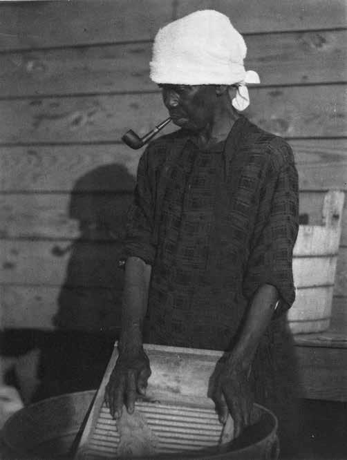 A woman wearing a darkly patterned dress and white turban smokes a pipe as she washes with a scrub board. Her shadow projects onto the unpainted clapboard wall behind her. A wooden pail on the table can be partially seen.