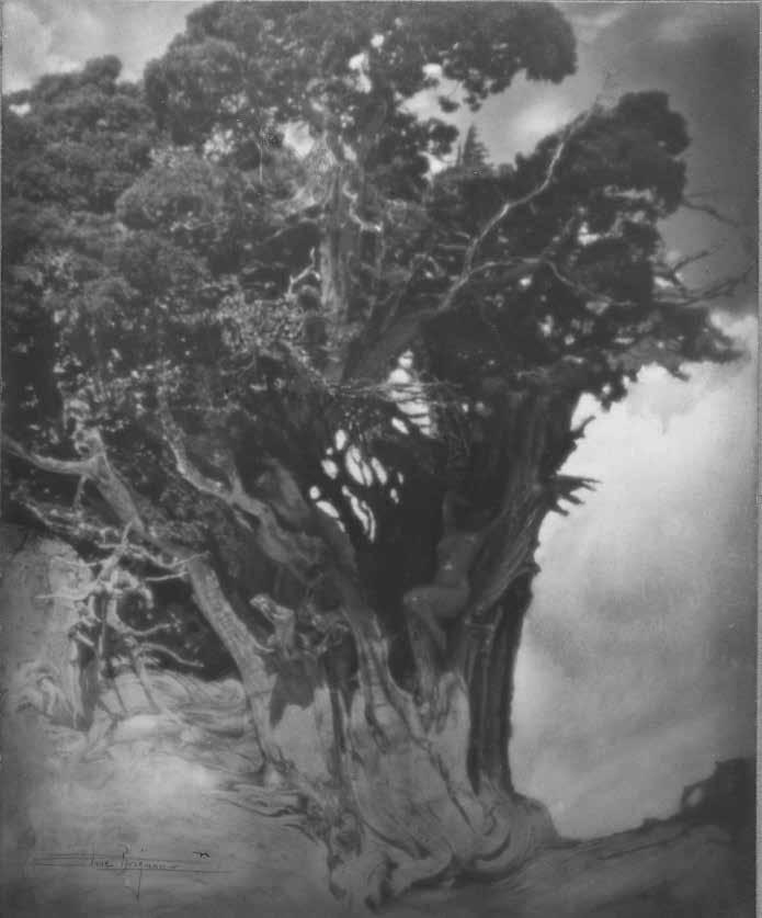 Brigman used images of trees to express freedom from social constraints. For example, “The Dying Cedar” shows a woman reaching from a gnarled tree to the sky. This image is a reference to a Roman myth about Daphne, a beautiful young nymph being pursued by Apollo, the sun god. She tries to evade his advances, and just before he can catch her, she pleads with the other gods to save her. The gods respond by transforming her into a tree.