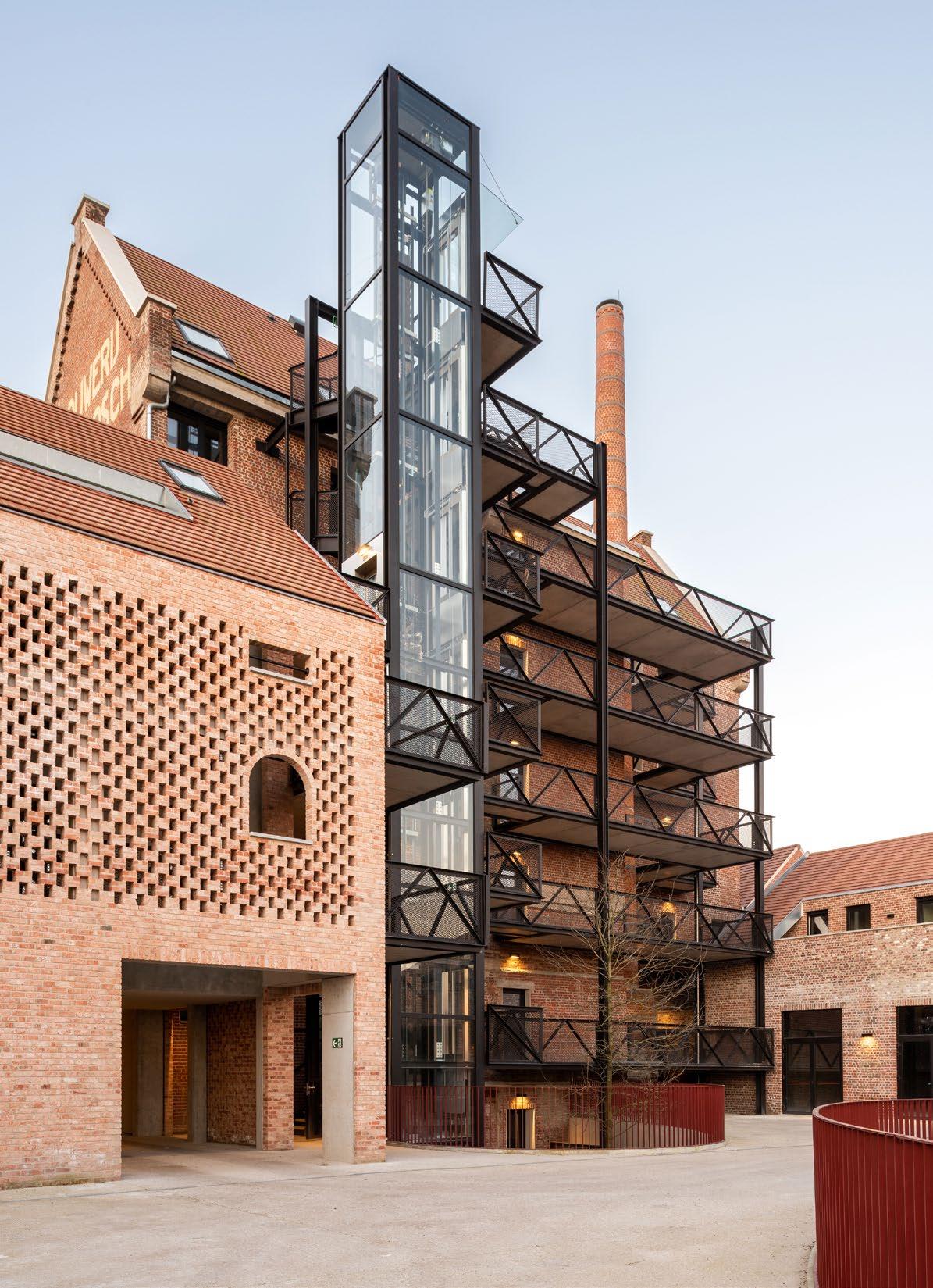 In een voormalige brouwerij zijn 55 appartementen en verscheidene handelsruimtes ondergebracht, een schoolvoorbeeld van de herbestemming van een historische structuur. Het gedempte kleurenpalet en het tactiele gebruik van baksteen creëren een verfijnde connectie met de bestaande omgeving, als een subtiele lijn tussen oud en nieuw.