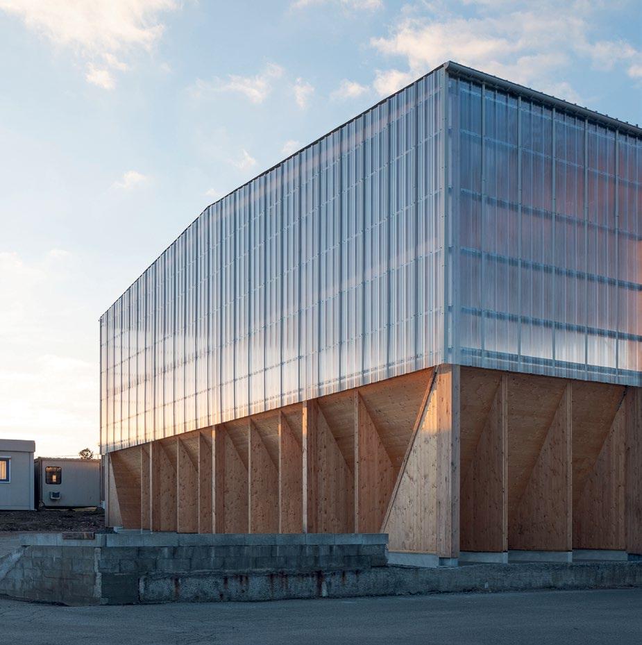 La structure sculpturale en bois de cet entrepĂŽt de sel se dresse, impressionnante, dans le vaste paysage rural. Elle sâinspire de lâarchitecture locale et rĂ©sonne avec les forĂȘts environnantes. La partie supĂ©rieure translucide en polycarbonate apporte de la lĂ©gĂšretĂ© et sâanime de jeux de lumiĂšre quand le soleil lâĂ©claire.