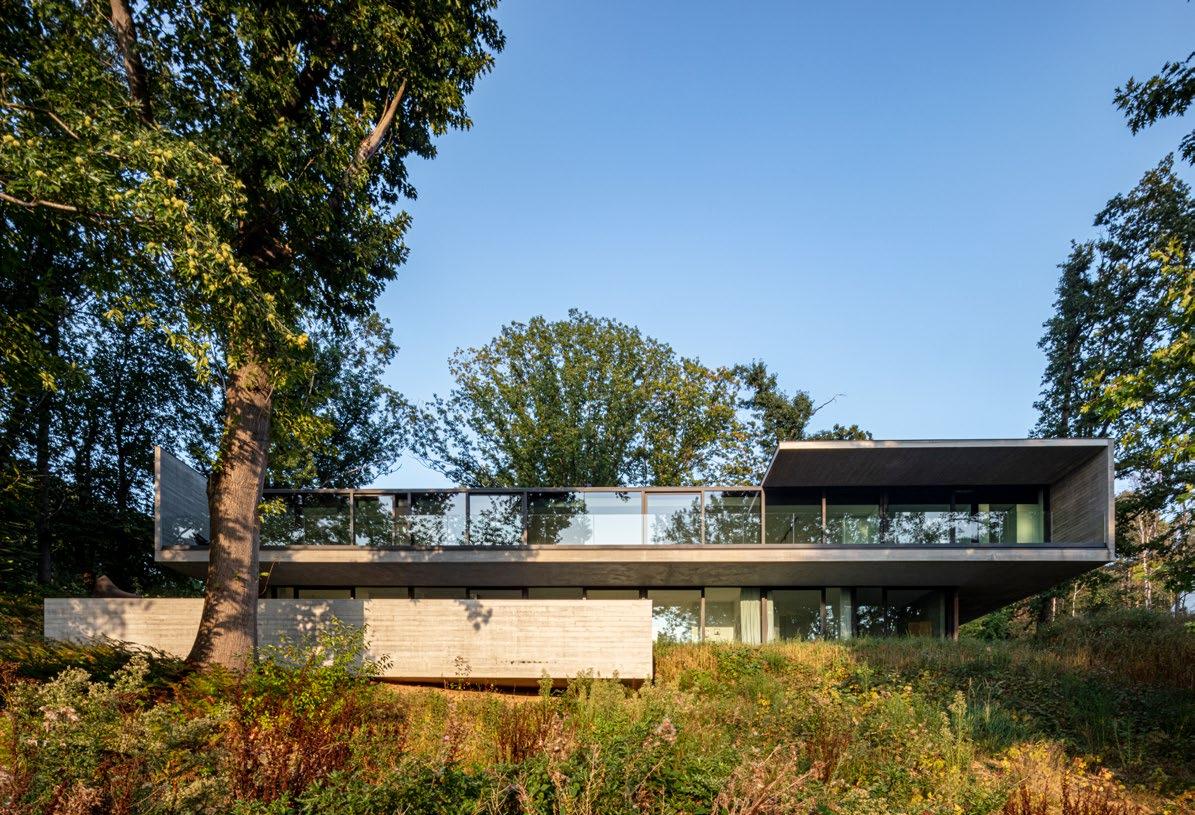 De architecten maken handig gebruik van de steile helling van het perceel om een extra benedenverdieping en een zwembad aan het oog te onttrekken. Aan de andere kant creëren meanderende, deels in het terrein ingebedde muren een riante openluchtruimte. De ruwheid van het enorme volume in beton wordt verzacht door grote vlakken in hout.