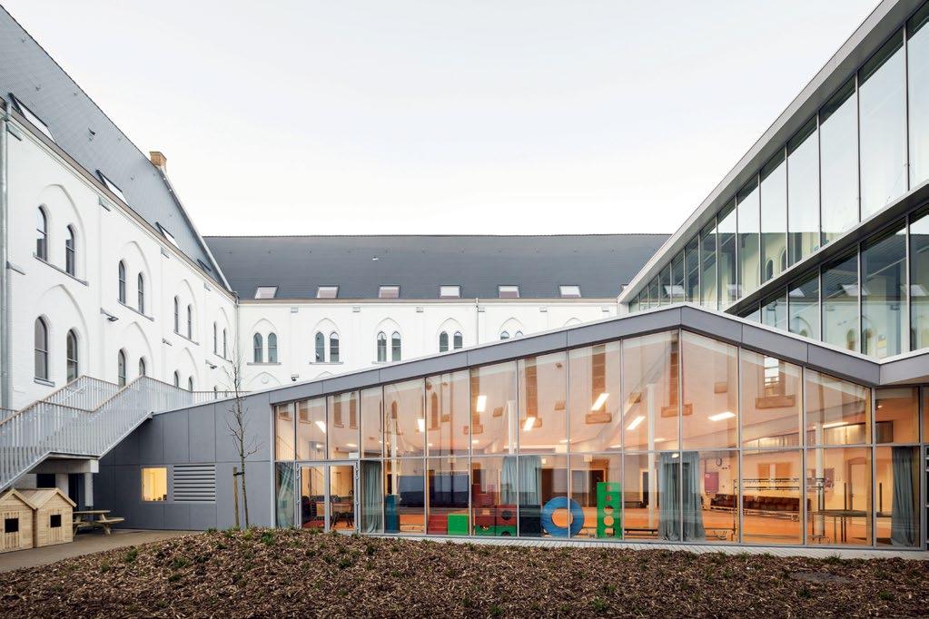 The complex of the former Convent of the Sisters of Charity of Jesus and Mary, built in 1877, has been transformed into a nursery and primary school. The renovation, in collaboration with EVR-Architects, gave the neo-Gothic buildings a subtle modern twist adapted to contemporary requirements.