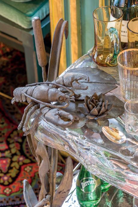 A pair of sculpted lobsters in dark metal mounted on a crystal drinks table, blending naturalist whimsy with surreal elegance, refinement infused with wonder.