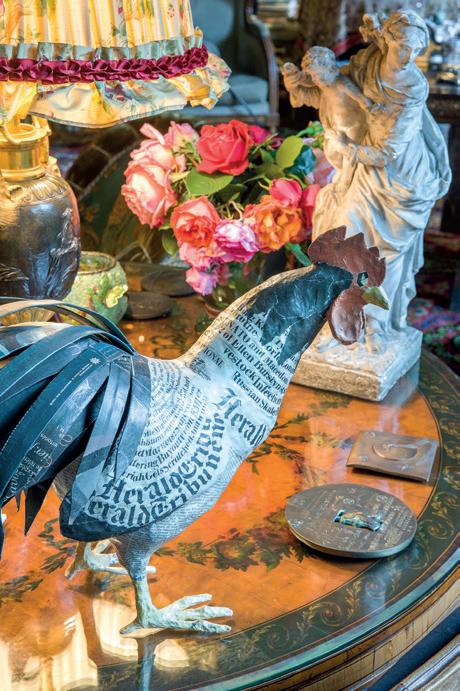 On an inlaid table, a rooster sculpture crafted from papier-mâché and printed newsprint adds a touch of humour and levity.