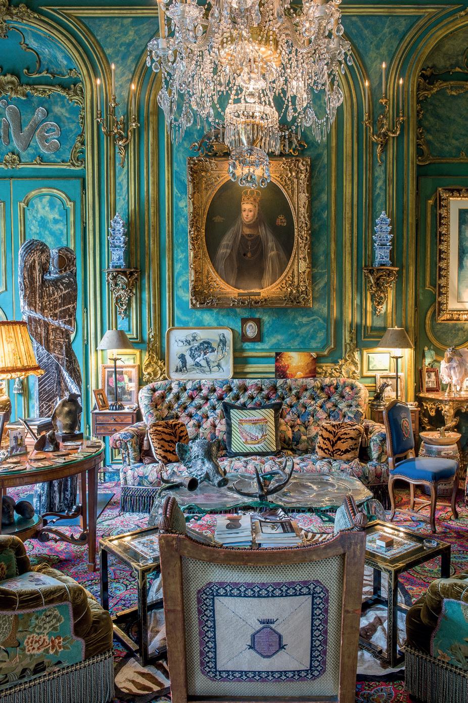 Polish lineage, French style, and international sensibility converge quietly in the décor. The inspiration is never literal, but it lingers in the scale of the rooms, the textures of embroidered textiles, and a palette of deep blues, soft golds, and muted greens. It finds expression in antique tapestries, sculptural accents, and family heirlooms. Like the Sisley brand, the home draws its strength from nuance and depth, not spectacle.
