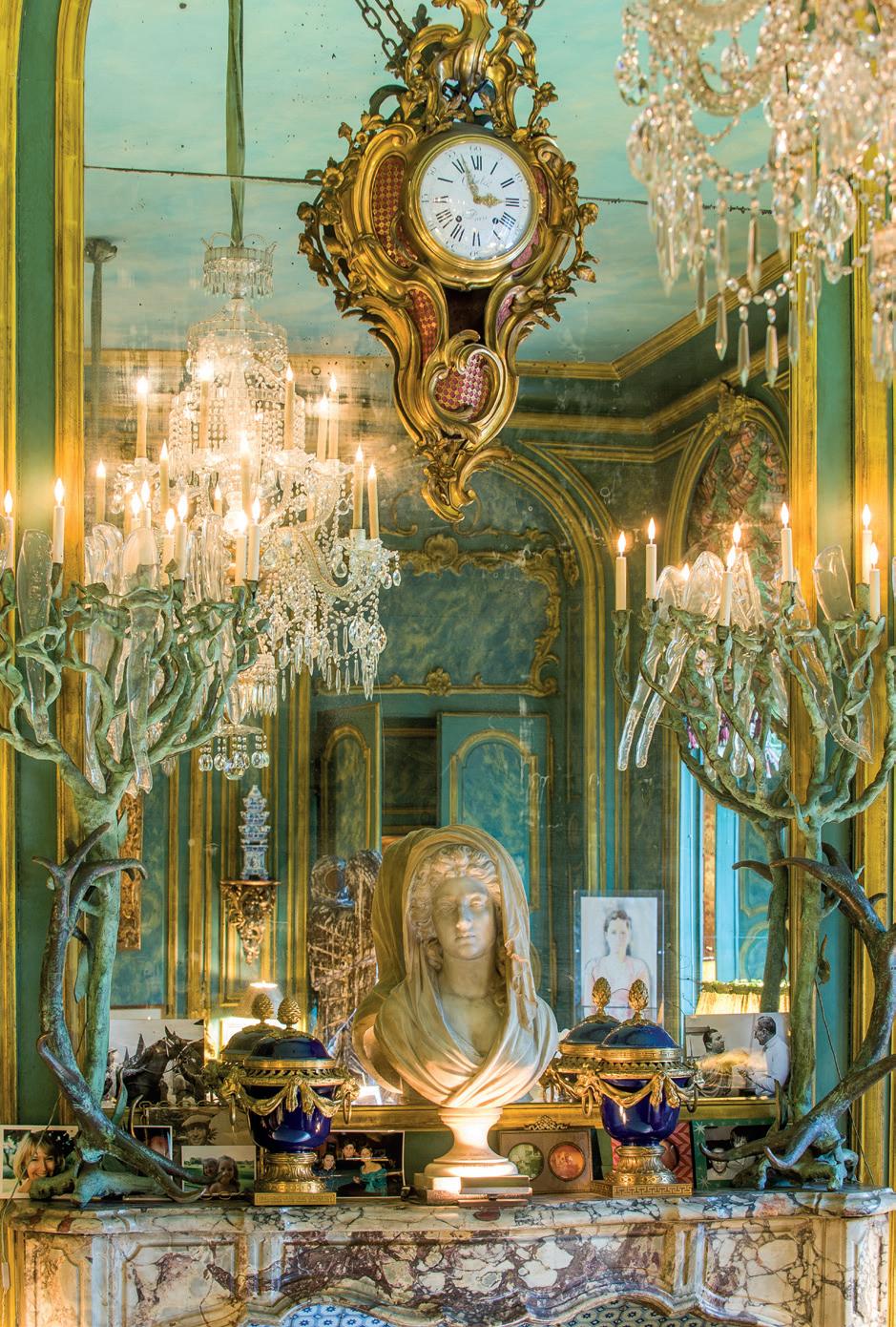 On the mantelpiece, a neoclassical bust of one of Isabelle's ancestors stands beneath a Louis XIV-style cartel clock, flanked by custom candelabras by Bronisław Krzysztof.
