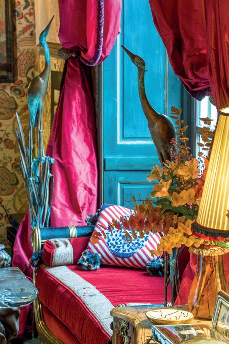 Framed by crimson drapes and a vibrant blue shutter, a Napoleonic daybed becomes a stage for contrast and colour. Bronze herons stand sentinel beside a cushion embroidered with the d’Ornano crest.