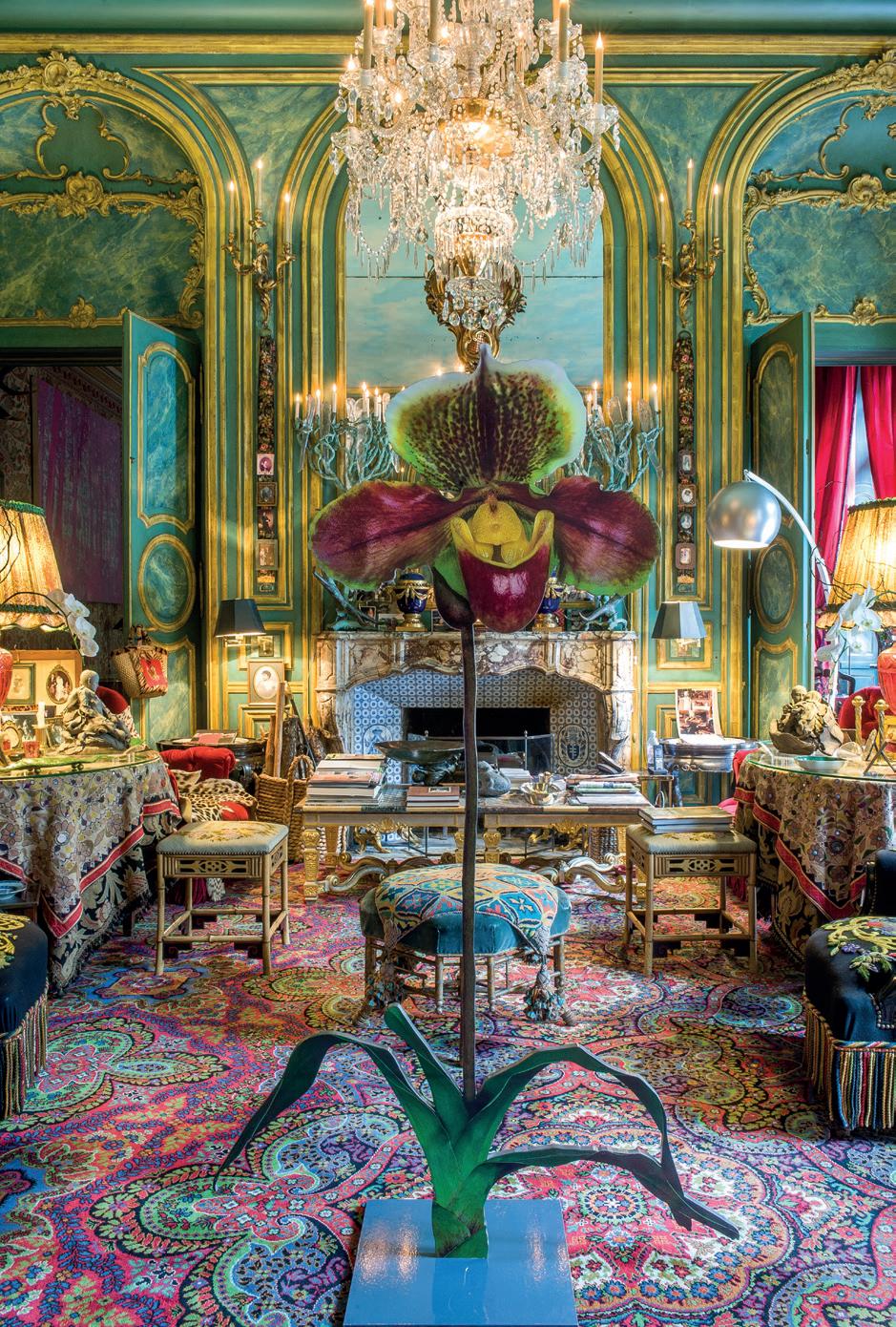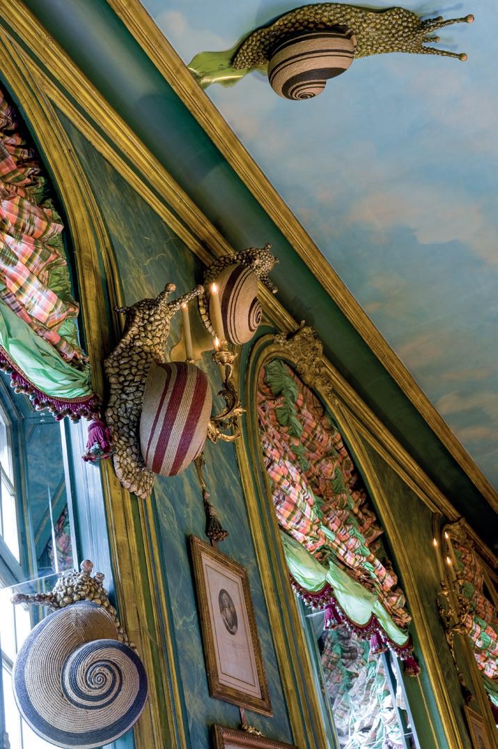 A procession of oversized snails by Jean-François Fourtou ascends the boiserie and ceiling, enchanting the formal architecture with playful surrealism.