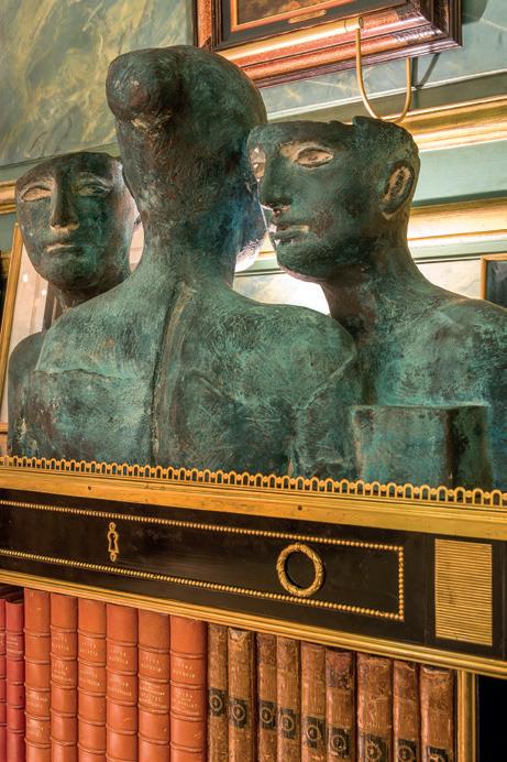 Perched above a neoclassical bookshelf, this trio of enigmatic bronze heads by Igor Mitoraj lend the room an air of ancient mystery.