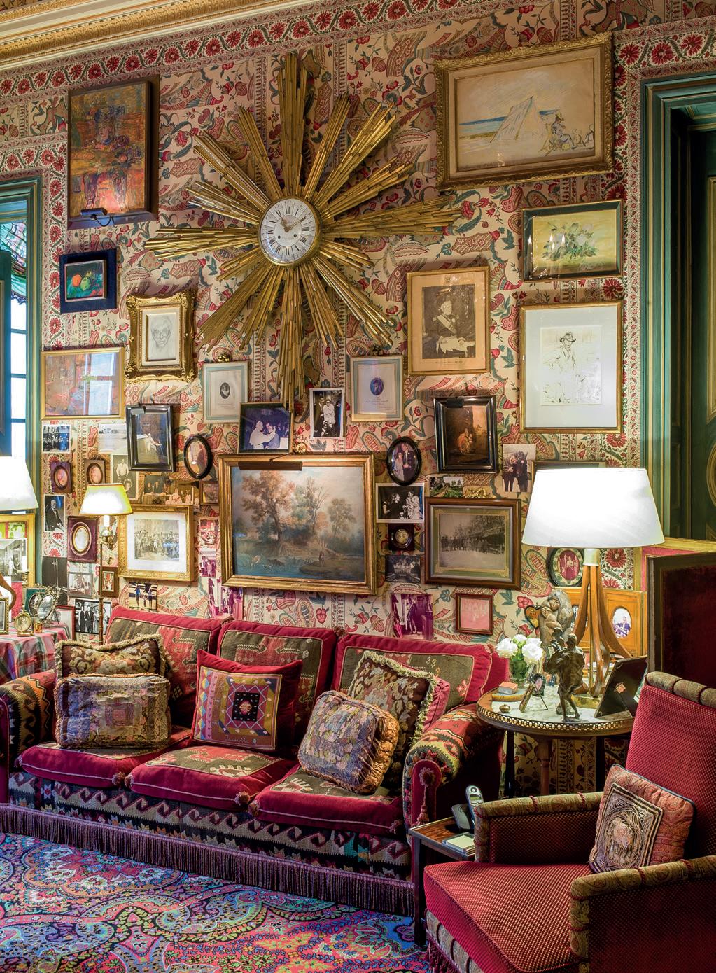 In this salon, lined with Braquenié fabric, a sunburst clock presides over a gallery of family photos, drawings, and collected paintings. The walls become a visual diary, woven with memory, lineage, and affection.