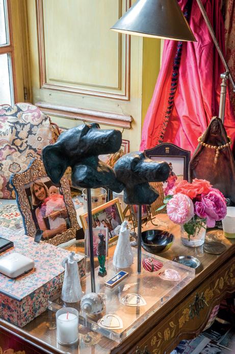 On a lacquered writing desk, a pair of sculpted dog heads – playful and alert – stand among family photos, porcelain figurines, and fresh peonies.