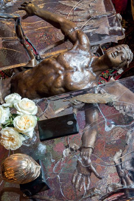 A dramatic bronze figure of Icarus, arms outstretched in mythic surrender, is embedded in a transparent table by Bronisław Krzysztof.