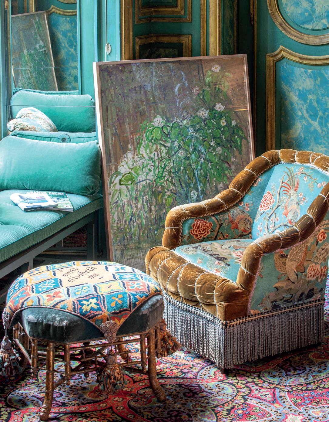 A fringed velvet armchair in floral brocade, an embroidered ottoman, and a casually leaned painting capture the home’s layered spontaneity.