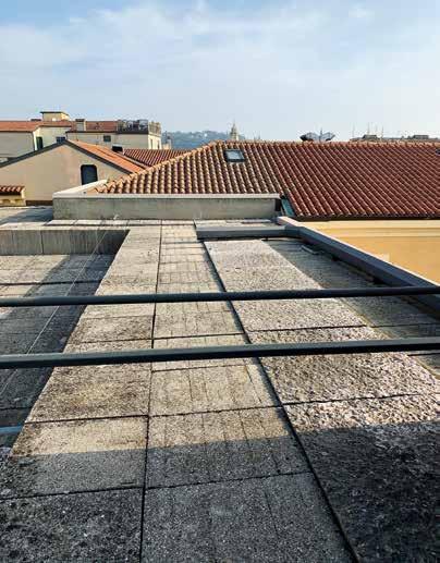 to the passage of the ventilation ducts between two main metal beams. The waterproofing is covered with slabs on platforms according to a specific design comprising Prun stone slabs with a natural finish and aggregate concrete slabs.
