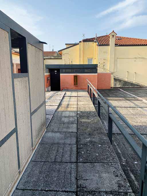 156. The raised part of the roof runs along the loggia on the courtyard side and stops to the right of the old building. The waterproofing is hidden by slabs on platforms.