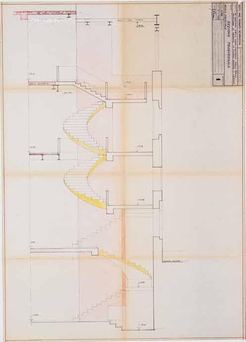 208. The spiral staircase was built in the second phase on the site of the Palazzo Righetti. The last three floors around the shaft were built using steel beams, as they were located in the existing palace. The floor at level 0.00 is made of concrete. Renato Scarazzai’s Archives.