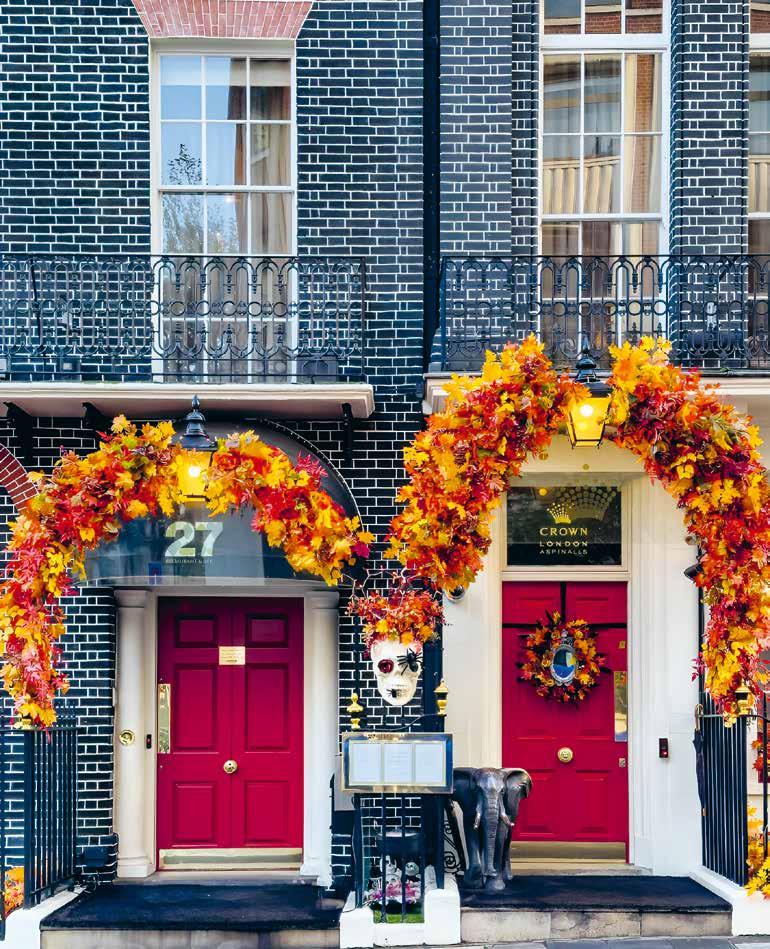 These pages: London’s façades between enchanting fall foliage and Halloween glam: Walls and entrances aglow in warm autumn colors.