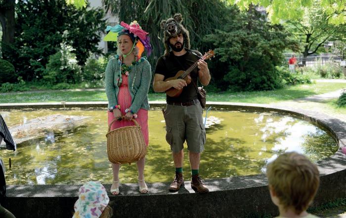 One thing that recurred when we were planning the Climate Garden was the theme of storytelling, especially storytelling for younger children. We got in touch with Minitheater Hannibal, an outfit run by a delightfully eccentric couple who developed a story especially for the Climate Garden. Dressed as a flower and a wild boar, the two actors led their young audience through the park on a hunt for butterflies. Along the way they met different creatures, who all had something to say about how the climate used to be (old tortoise), and the problems they were having now (Suzette the bee with her insect hotel). The topic of photosynthesis, water sharing, what plants were still available for food, and interspecies (plant/animal) relations were all raised in a playful and engaging way.