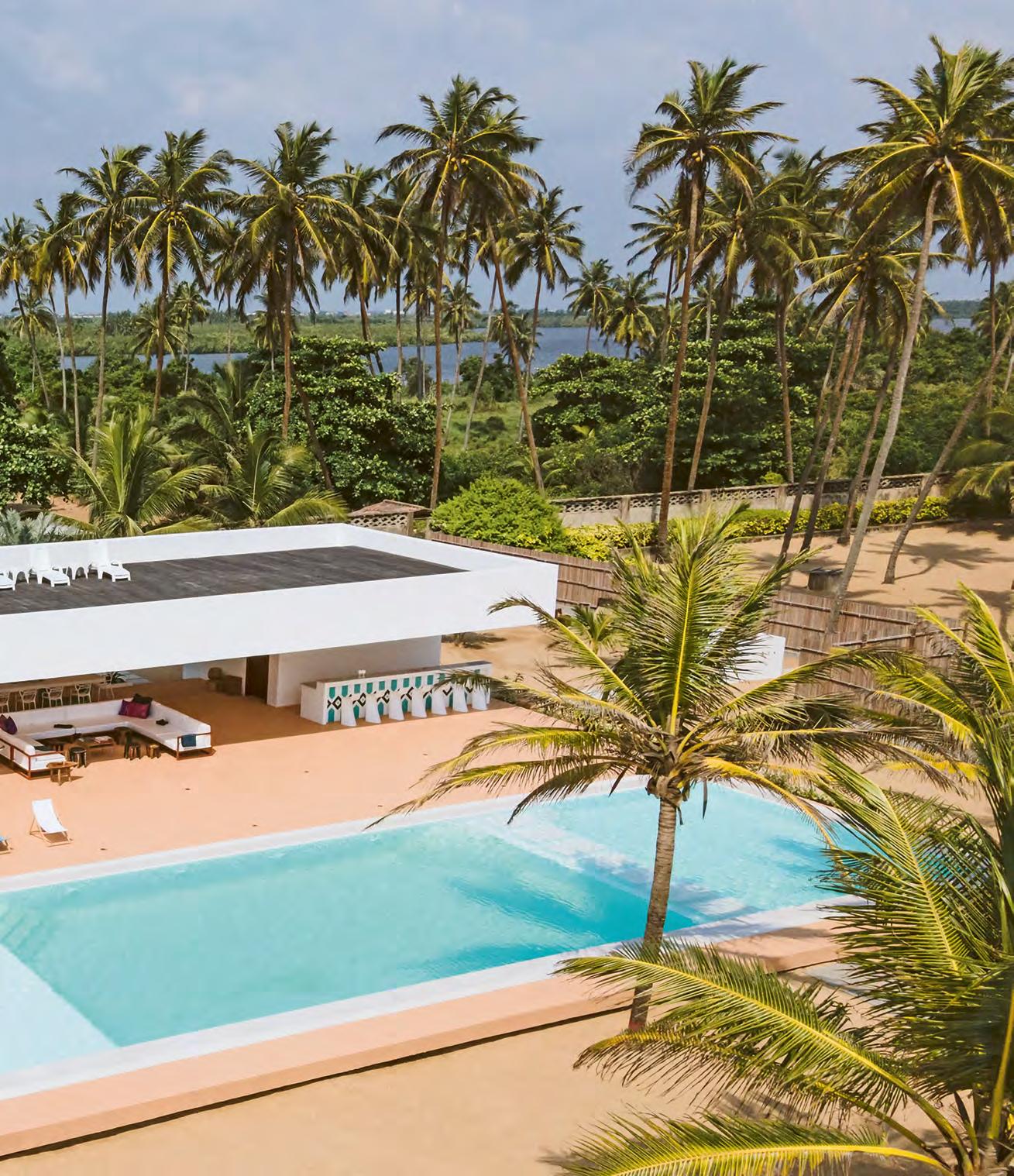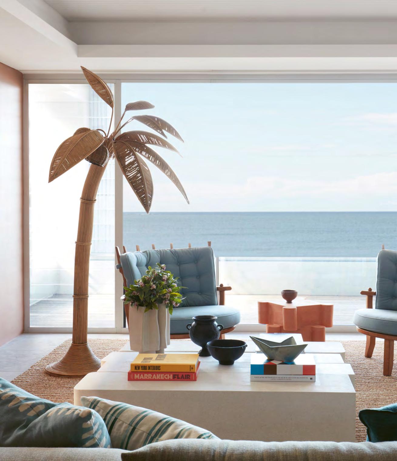 This threestory holiday home sits on an enviable block directly across from the beach, so natural light and mesmerizing views were a given. To counter the robust nature of the structure and the linearity of the openplan living space, the designers opted for a soft focus with vintage pieces and organic shapes in natural materials such as rattan, limestone, and wicker. They chose playful accessories, including a vintage rattan palm tree and a custom handwoven light fitting by New York artisan Doug Johnston, and bold pieces such as Gaetano Pesce’s ‘Up’ chair in perky red and white stripes.