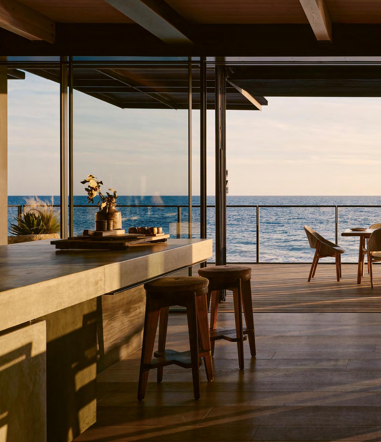 At the entrance is a large pivot door with a pull created to look like a piece of driftwood. It opens to an entry space that is screened from the open living area by a wooden sculptural screen designed in the form of an ocean wave. On the beach side, a woodframed sliding door opens to a generous terrace with outdoor dining, living, barbecue, and pool. The saltwater pool is surrounded by an infinity edge so that the water sits perfectly level with the floor level of the home and serves as a mirror that reflects the blue ocean and sunsets.