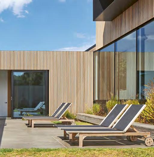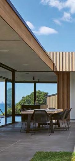 Fullheight glazing and sliding glass doors on both sides of the room provide a sense of transparency and make the interior and exterior boundary almost imperceptible. The floor flows seamlessly outside to the patios and swimming pool, and an outdoor living and dining area sits shaded beneath the concrete overhang. The spiral staircase leads to two bedrooms with ensuites. There also two bedrooms with ensuites in the secondary part of the house, which is connected to the living area via a glassenclosed hallway with courtyards to each side.