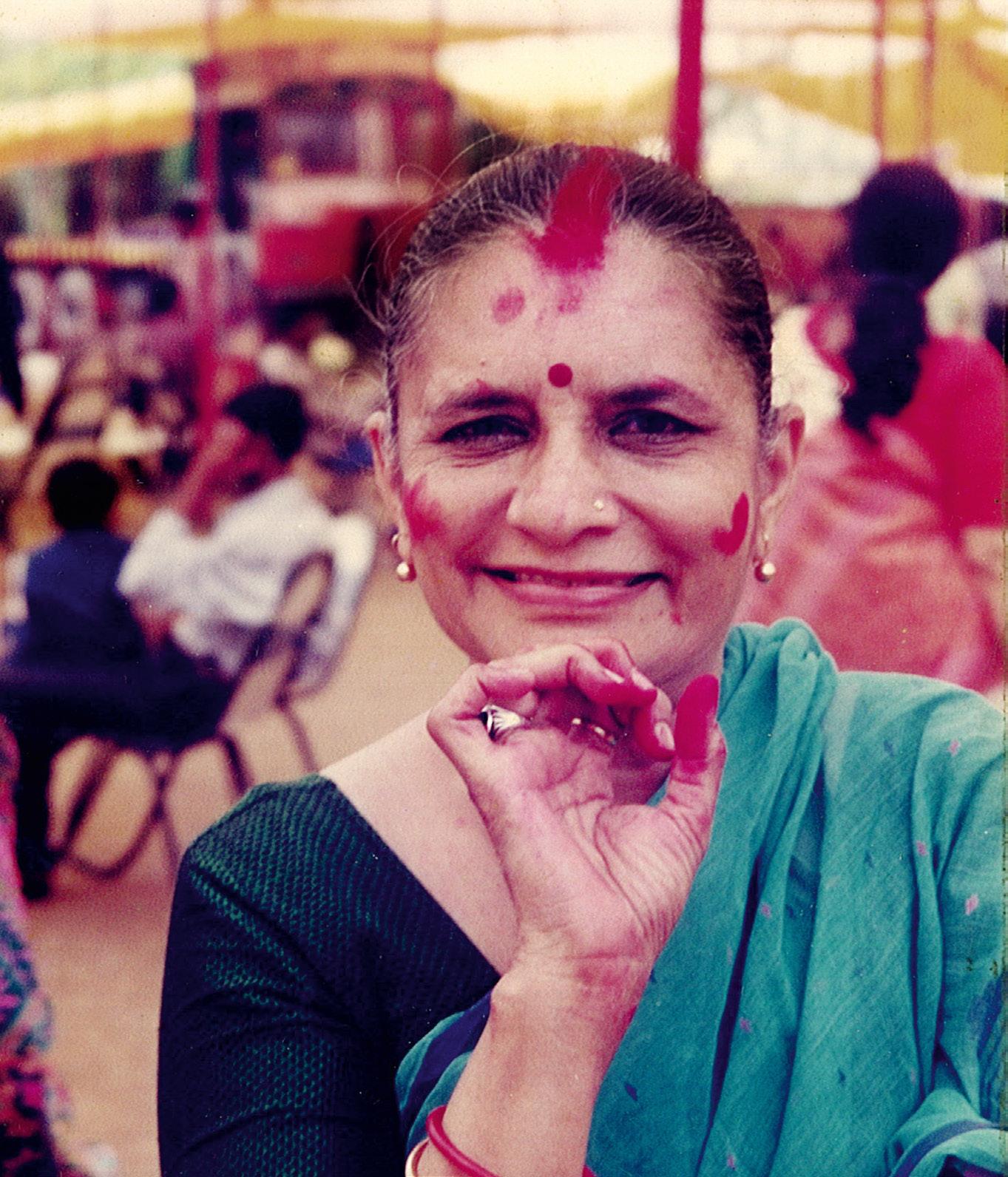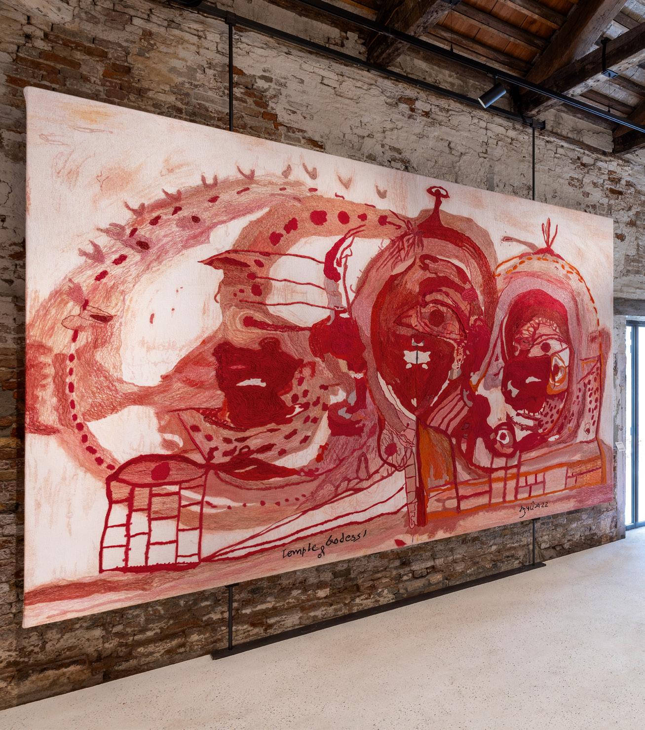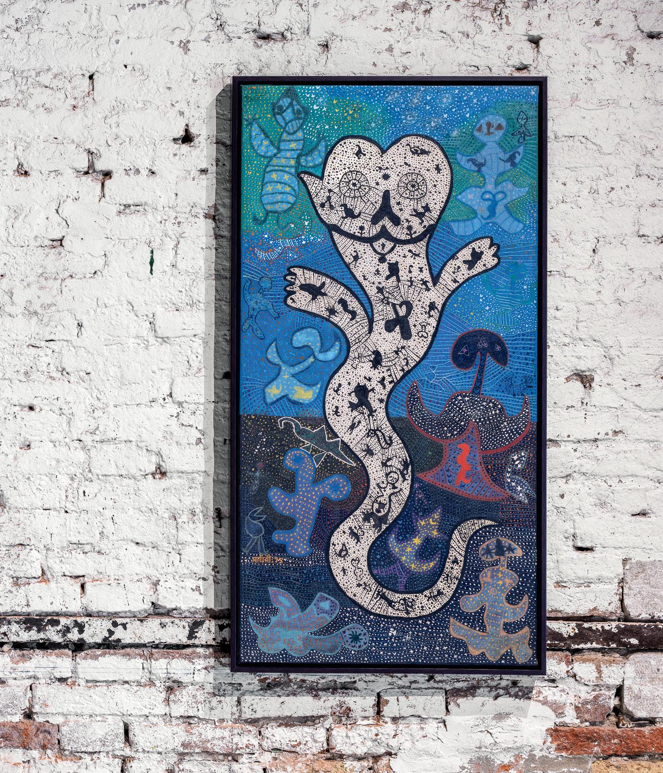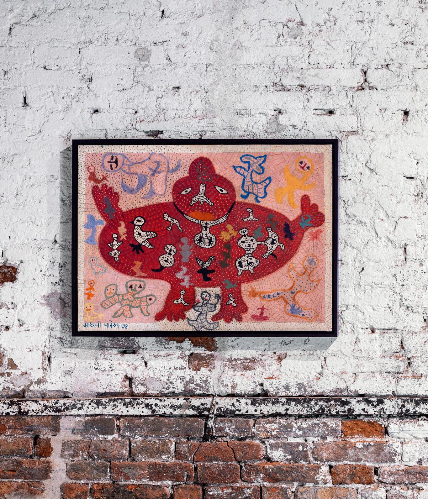shrines that were rudimentary and decorated by bright contrasting colours: vermillion, turmeric and multani brown. Similarly, there are the animals who pose as wayfarers in our lives. In a time where we are desperately seeking an equilibrium with other life in our universe, elevating animals to hold an equal place reveals a deep philosophical approach to life. This perspective underpins a deep animist respect, where all life is essential and in rhythm with our own, as Madhvi conveys in her art. The icon-isation of the primal Mother Goddess is a mirror of the vision she holds for a world degraded by shrewdness, loss of innocence, and impure ailments. The expressionist forms of the goddess in Madhvi Parekh’s depiction appear to be a relentless quest for the mysteries, as noted by Campbell, of the sustenance and retaining of the values that charge her brushes.
