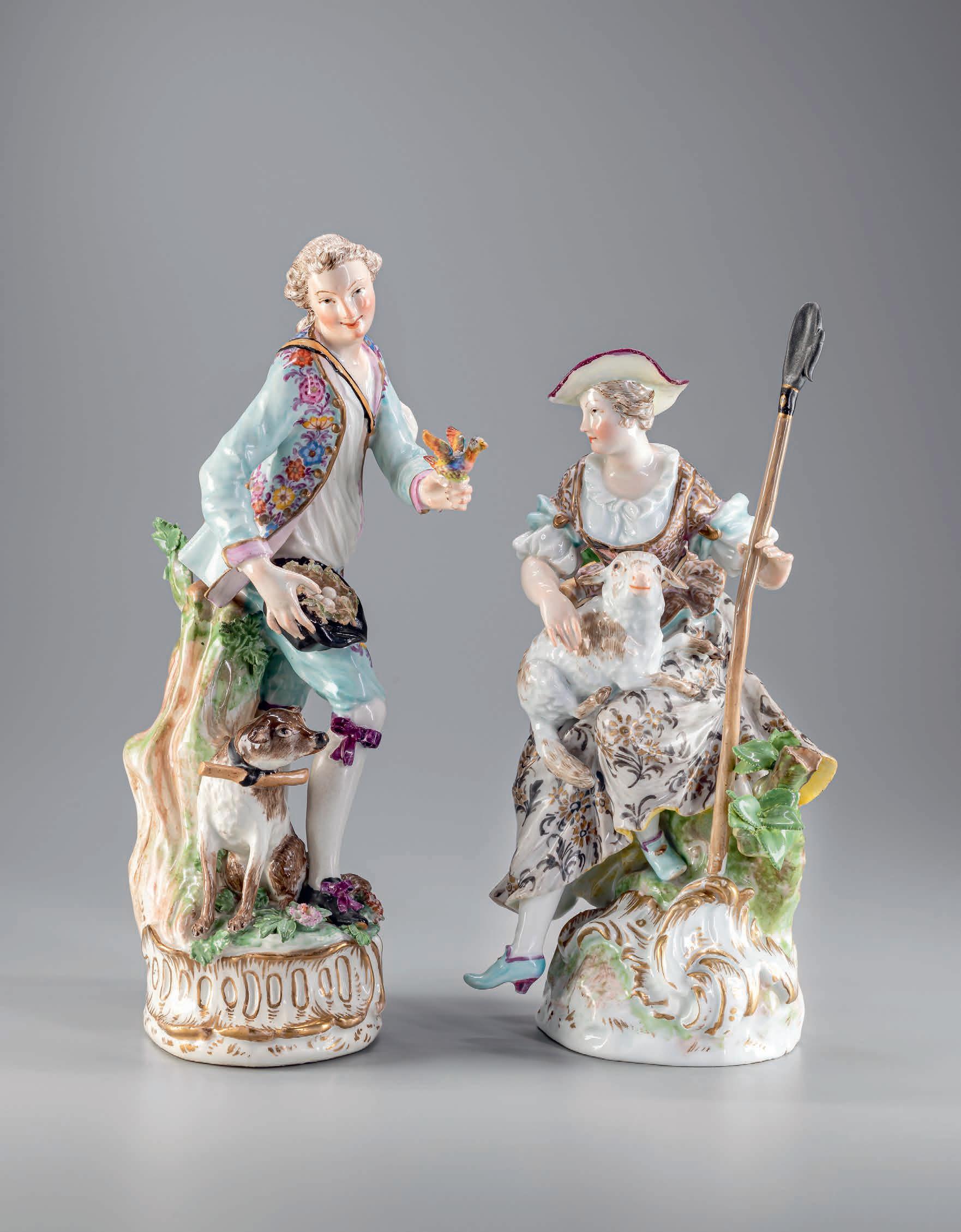 Herr auf Rocaillensockel, der in einen Baumstumpf übergeht und ihm Halt gibt; Kopf nach rechts gewandt, zu seinen Füßen ein sitzender, braun gefleckter Hütehund mit Knebelhalsband, in seiner ausgestreckten, linken Hand ein flatternder, bunter Vogel, in seiner rechten Hand der umgedrehte schwarze Hut, darin ein Vogelnest mit Eiern, bekleidet mit türkiser Kniebundhose und farbig entsprechender langer Jacke mit Blütendekor und Goldrand, schwarzen Schuhen mit purpurfarbener Schleife, naturalistisch modelliert und staffiert; unglasierter Boden. Das vordergründige Thema der Schäferin und des Schäfers mit den entsprechenden Begleittieren und Accessoires war besonders beliebt, um amouröse Inhalte darzustellen. Zwar wenden sich beide Figuren einander nicht direkt zu, haben aber bereits eine innige Verbindung. Darauf verweisen das Vögelchen in seiner Hand und das Gelege in seinem Hut, ihr hervorgetrecktes Bein und die farblich bis ins kleinste Detail abgestimmte Kleidung, die zahlreiche gegenseitige Entsprechungen findet.