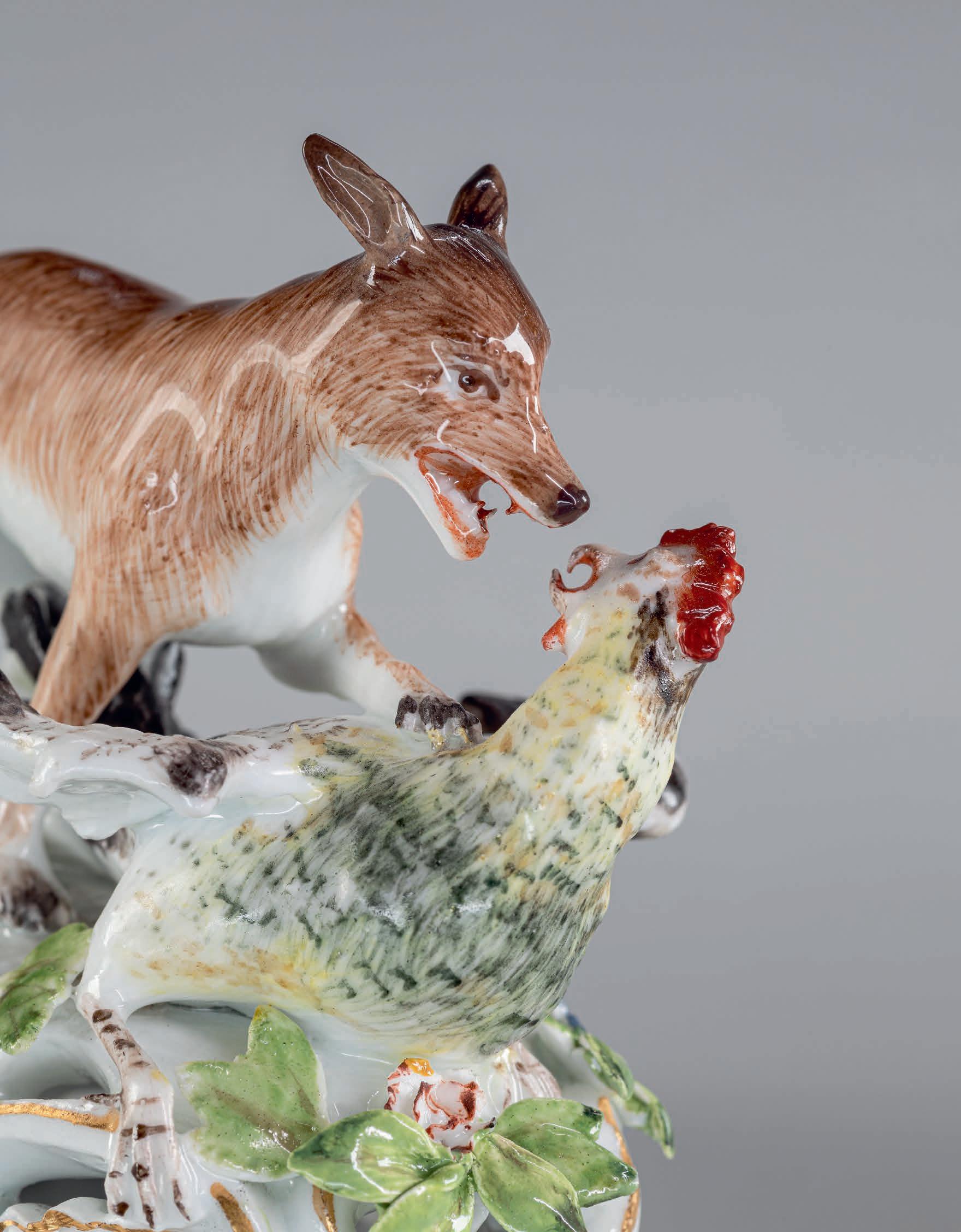 Gruppe mit Fuchs und Hahn auf ovalem, durchbrochenem Rocaillensockel, goldgehöht mit farbig staffierten Blüten und Blättern; Fuchs hat den sich mit ausgebreiteten Flügeln wehrenden Hahn gestellt und ist kurz davor zuzubeißen; naturalistisch modelliert und staffiert; glasierter Boden mit Brennloch.