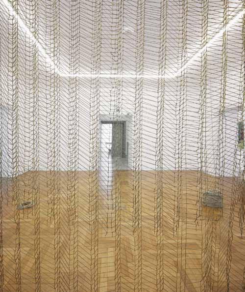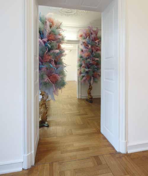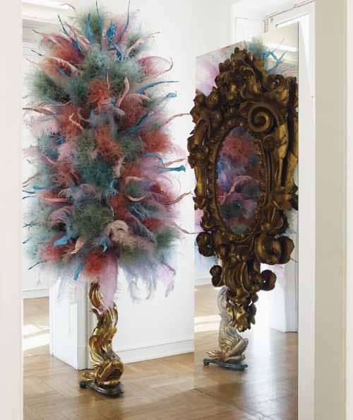 Mit olfaktorischen Reizen von Lavendel, Vergissmeinnicht und Rittersporn verfĂĽhrt Thierry Boutemy die Betrachter*innen mit allen Sinnen. w ährend der erste Kabinett raum märchenhaft in sich gefangen und von rätselhaft verschleierten Keramik bĂĽsten der KĂĽnstlerin Charlotte Coquen bevölkert ist, platziert in gustavianischem Mobiliar, bricht sich im gegenĂĽberliegenden Raum ein Rokoko Âf euerwerk aus federn und Gräsern in hellen Pudertönen Bahn. Auf vergoldeten DauphinÂStelen tĂĽrmen sie sich – an die modischen Hochfrisuren des ausgehenden 18. Jahr hunderts angelehnt – bis zur Decke, um einen ĂĽppig vergoldeten Spiegel zu flankieren, inbegriff des narzisstischen Zeitalters, das in Spiegelkabinetten und Âsälen den höfischen Luxus ins unendliche vervielfachte. Hier wird das Rokoko mitsamt seiner ungezĂĽgelten Lust am labyrinthischen Verwirrspiel und an der inszenierung als immerwährendem fest in endlos wechselnden Dekorationen greifbar.