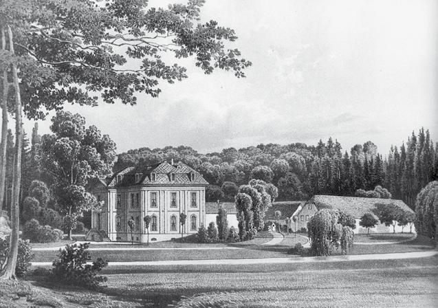 — 29 — Schloss Morsbroich, Ansicht von Norden/ view from the north, Lithografie nach Aquarell/lithography produced from a watercolour von/by Gustav Gerlach, 1861