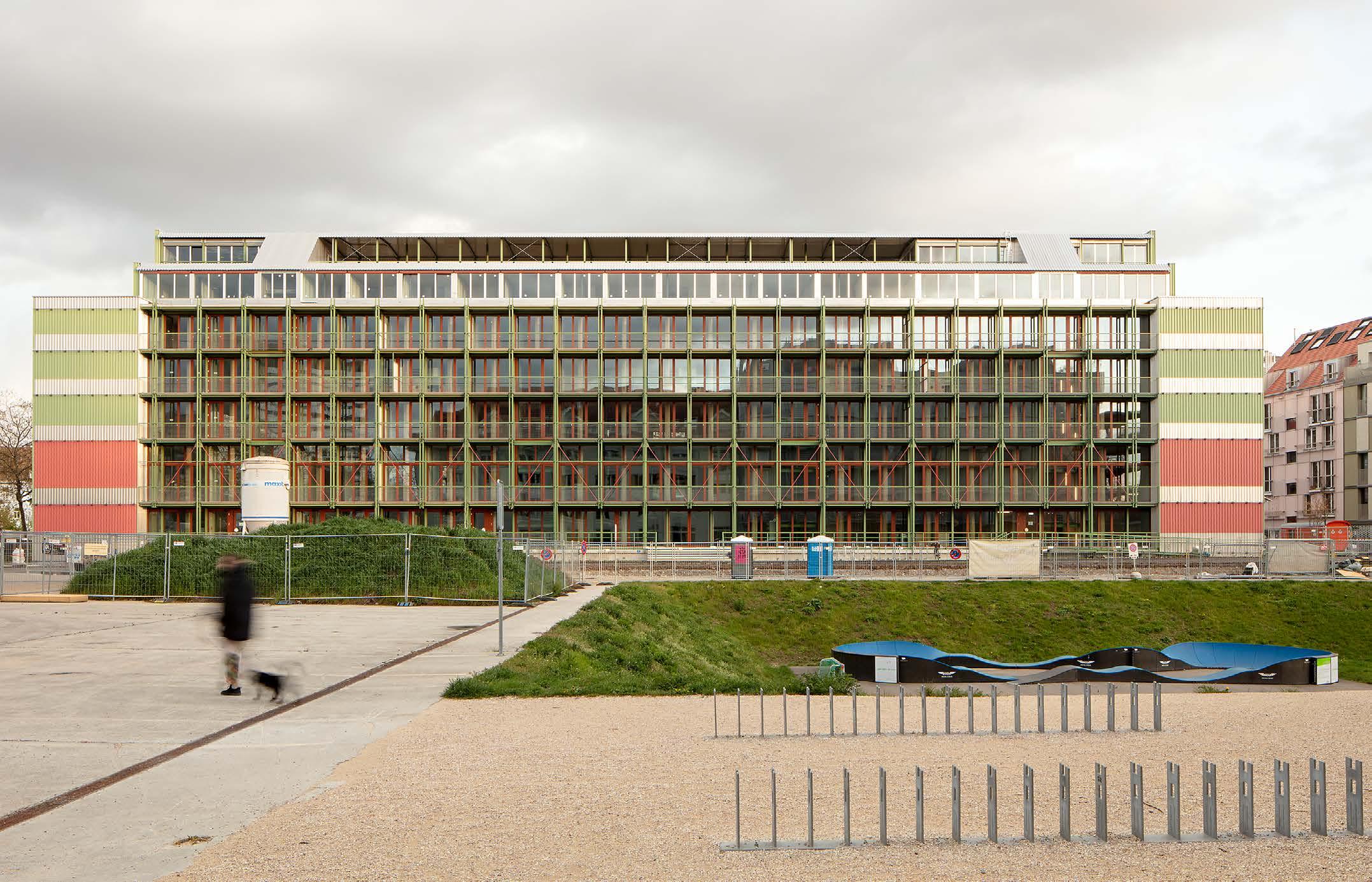 the architects themselves choose to use unusual analogies to describe their highly structured, seemingly randomly formed architectural volumes – derived, for instance, from geology – this in fact only concerns the side facing the railway tracks. Facing the street, the buildings are staged calmly and almost conventionally. Here they indeed act as part of the fabric, completing it with a seam towards the railway tracks. The splicing with the urban fabric is normal and conventional. The boundary, on the other hand, is specific and unique.4