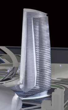The building’s skin, which uses a high-performance, lightweight polymer ethylene tetrafluoroethylene (ETFE), was designed to have high corrosion resistance and strength over a wide range of temperatures. The cladding is also designed to intelligently respond to solar radiation and wind. The lower floors engage the inward-sloping skin, so tenants will have access to direct views with minimal thermal penalty. The upper floors disengage from the skin, allowing for a climatic buffer and the integration of a photovoltaic energy field to enhance buoyancy-driven wind-flow.