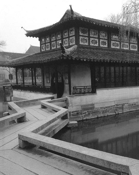 园林中水面之有桥,正如陆路之 有廊,重要可知。苏州园林习见之桥, 一种为梁式石桥,可分直桥、九曲桥、 五曲桥、三曲桥及弧形桥等,其位置 有高于水面,与岸相平的,有低于两 岸,浮于水面的。以时代面论,后者 似较旧,苏州艺圃、怡园,无锡寄畅 园及常熟诸园所见的,都是如此。它 所表现的效果有二:第一,桥与水平, 则游者凌波而过,水益显汪洋,桥更 觉其危了; 第二,桥低,则山石、建 筑愈形高峻,与丘壑、高楼自然成强 烈对比。无锡寄畅园假山用平冈,其 后以惠山为借景,冈下幽谷间施以是 式桥,诚能发挥明代园林设计之高超 技术。今日梁式桥往往不照顾地形, 不考虑本身大小,随便安置,实属非 当,尤其栏杆之高度、形式,都要与 全桥及环境作一番研究才是。上选者, 如艺圃小桥、拙政园倚虹桥。拙政园 中部的三曲五曲之桥,栏杆比例还好, 可惜桥本身略高一些。待霜亭与雪香 云蔚亭二小山之间石桥仅搁一石板, 不施栏杆,极尽自然质朴之意,亦佳 TONGJIUNIVERSITYPRESS