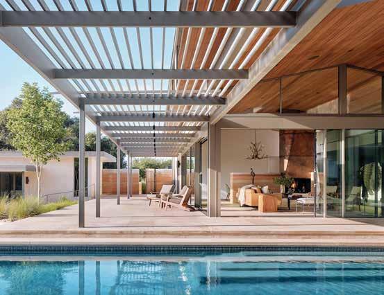 The architecture incorporates deep steel trellises and vertical wood screens, reminiscent of the dappled shade provided by the surrounding oak trees. These elements offer an additional layer of protection against the sun while allowing for shaded outdoor spaces. The thick walls and shading devices enable large glass expanses that open towards the courtyard, offering uninterrupted views of the river. This design choice strengthens the indoor/ outdoor relationship, creating spaces where occupants can engage directly with the natural environment, from the rustling leaves of the trees to the tranquil flow of the river. Blanco River Ranch is more than just a residence; it is an architectural ode to the Texas landscape. It showcases how residential architecture can be sensitively and intelligently designed to embrace and enhance its natural setting, offering both shelter and a deep connection to the environment.