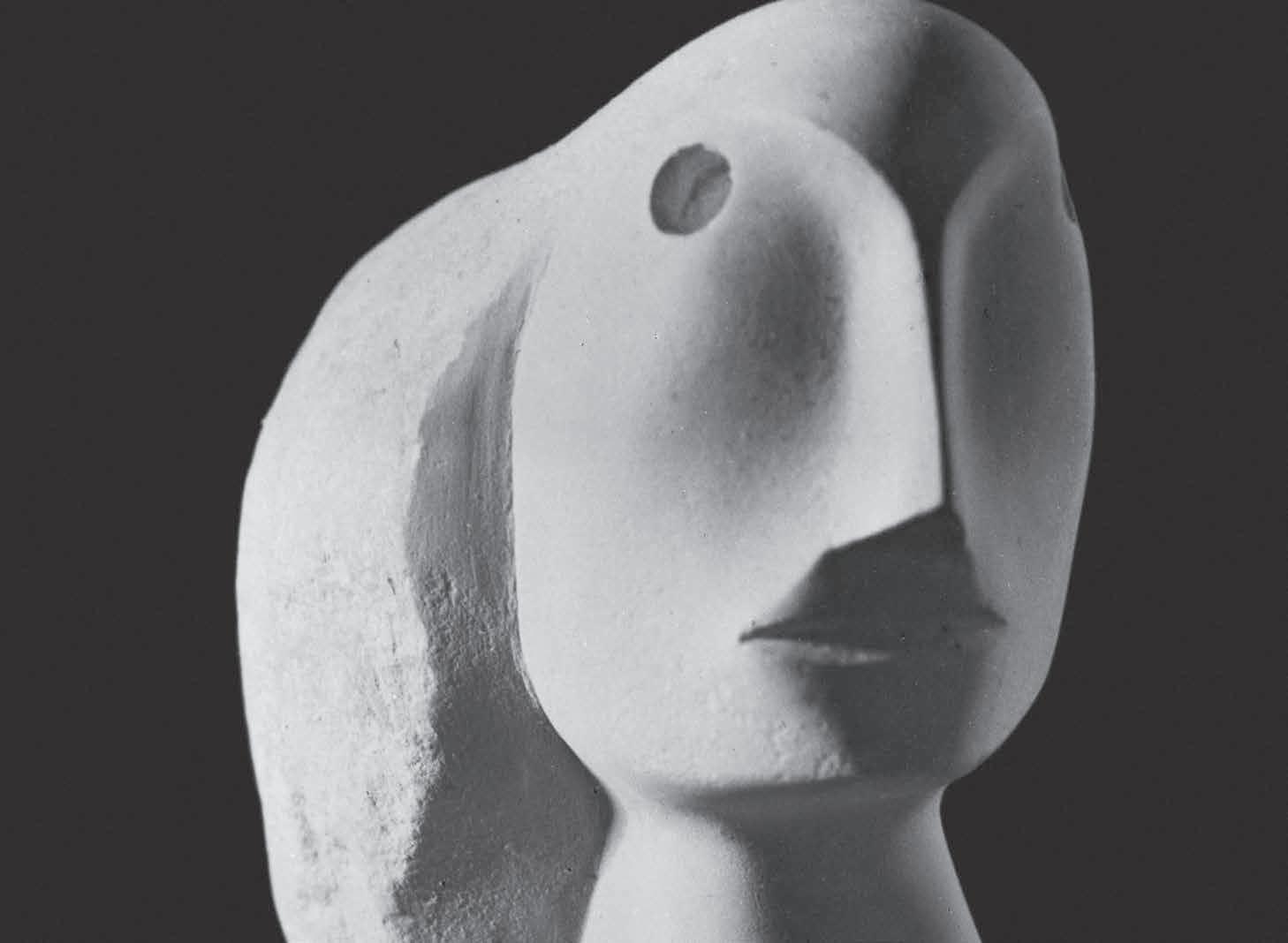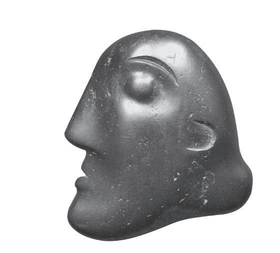 A key work in this regard is a small Head (ill. right and opposite) that belonged to Moore’s friend and patron, Kenneth Clark (1903–1983). It is one of several such heads carved from ironstone around 1930. Unlike the others, it does not stand up – as if made for exhibition – but is designed to rest in the palm of the hand. Retaining the feeling of the pebble from which it was carved, every part of its outer edge is curving, ensuring it could only ever lie, not stand, or be held between two fingers. It is impossible to see both of its contrasting faces at once, though both could be felt through touch. Anticipating Read’s lecture by over twenty years, Moore had made a modern amulet, a symbolic image that can only be experienced through the hand.