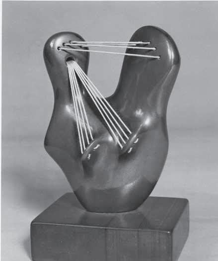 of wooden carvings that were more curvaceous and biomorphic. Some incorporated taut strings which suited a finer, less massive sculptural form. As his carvings became more plastic in appearance, he realised he could achieve that quality through different materials. Moore had made odd pieces in lead since the end of the 1920s but in the last years of the 1930s he embraced the medium enthusiastically (pp. 34 and 37). The low melting point of lead meant the artist could cast works at home, using saucepans on the kitchen stove. Such works would first be modelled in a plastic material, most likely plaster that could be shaped around an armature when semi-dry and then carved and sanded when hardened. The cast metal allowed for finer, more elastic forms than wood or stone could tolerate, and Moore admitted he liked the fact that something about the appearance of lead told you that it was poisonous.