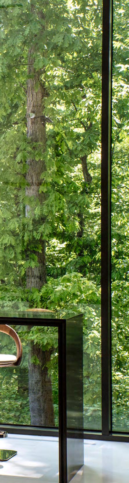 Facing the east and west sides of the property, solid masonry walls bookend the body of the house. The long façades facing the slope are entirely glazed, placing the occupants on a platform open above and below to the woods beyond. The south face is pushed toward the tree line, providing full shading from summer sun while admitting the low rays of winter. The north face needs no shading as it opens to the long views into the meadow and trees.
