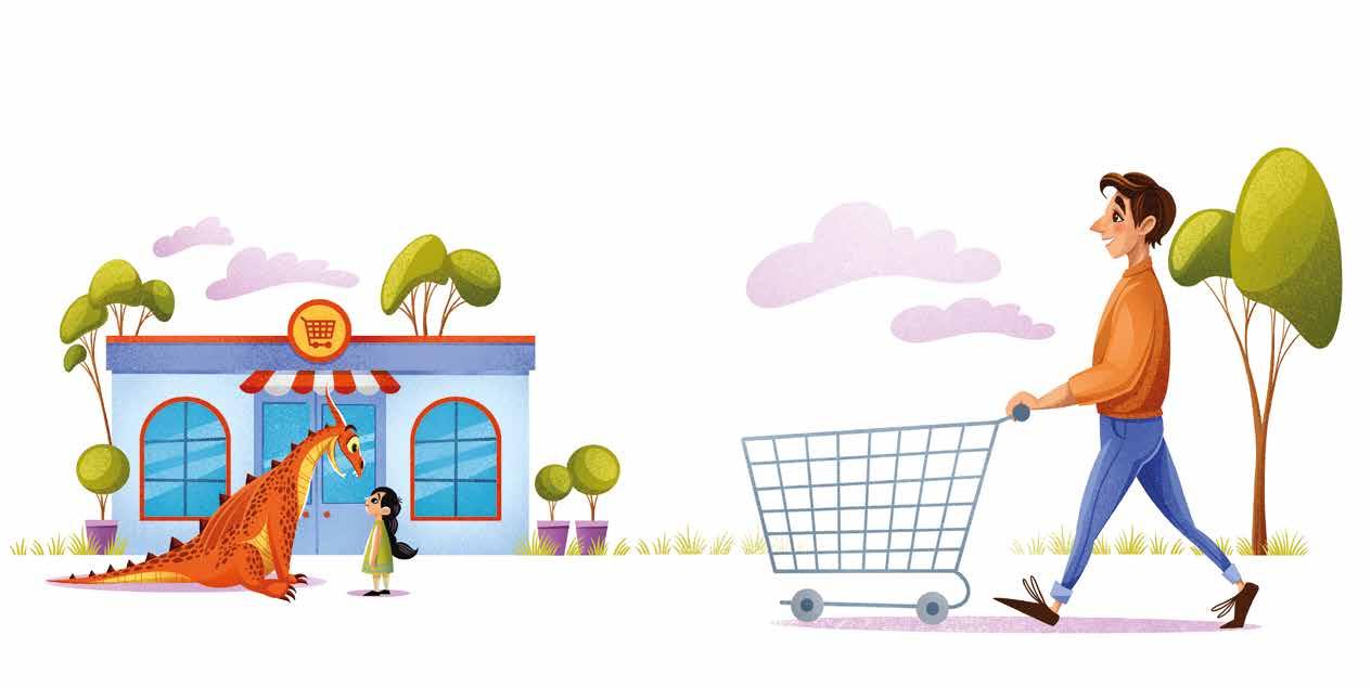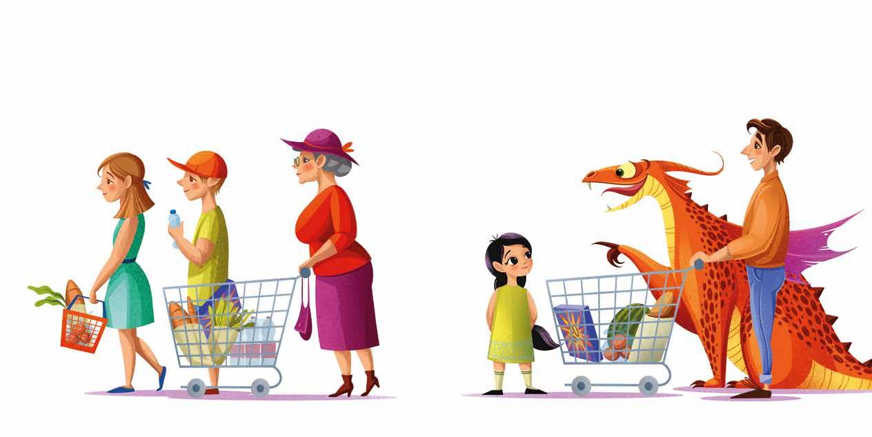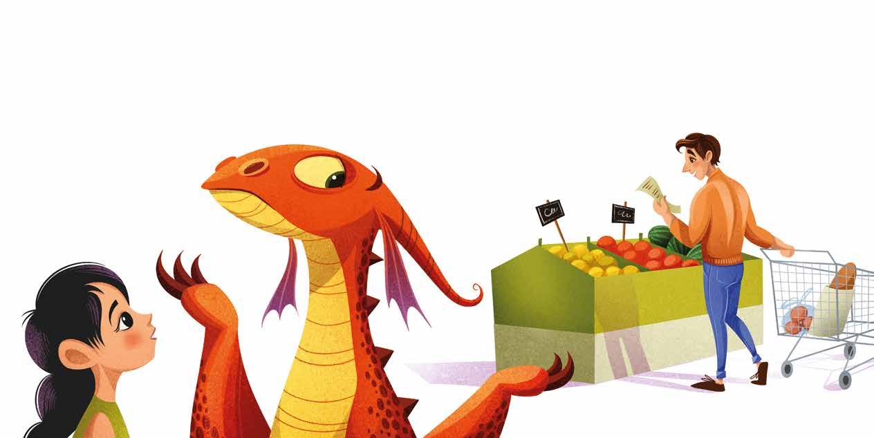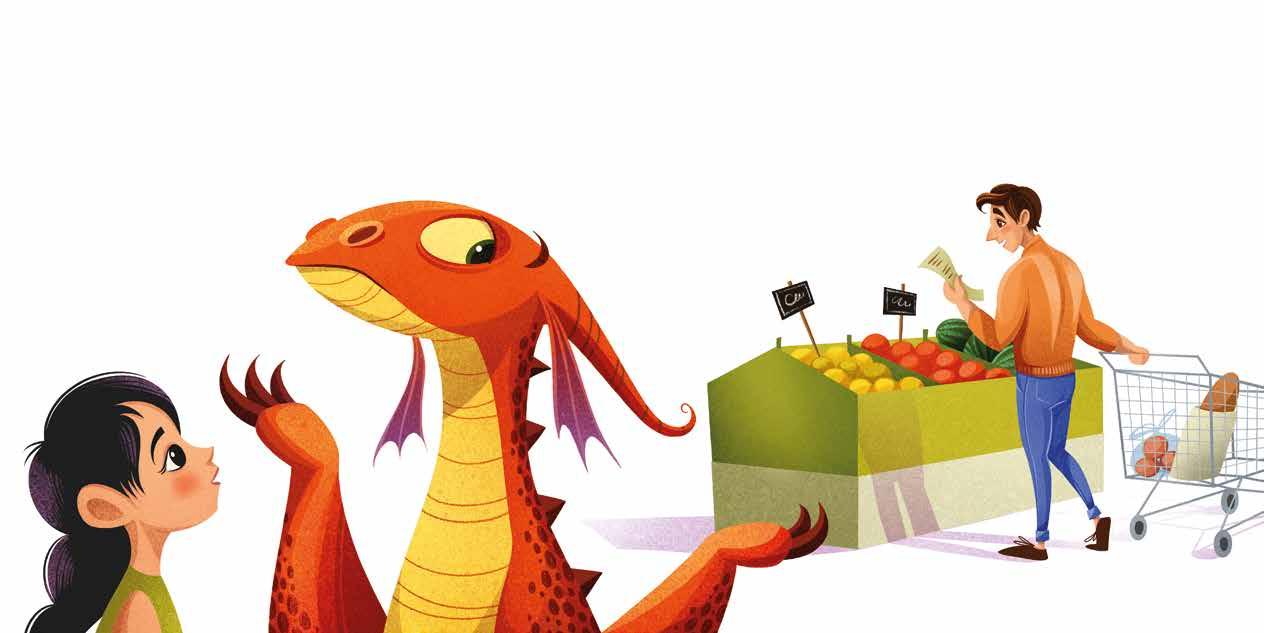 Baby Dragon stares the entrance of the supermarket mouth wide open. On his side, Lily smiles at him. In fact, in there it’s full of good things: fruit, vegetables, meat, fish, eggs… There are many shelves! And many people all over!
