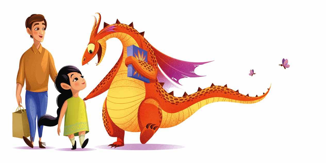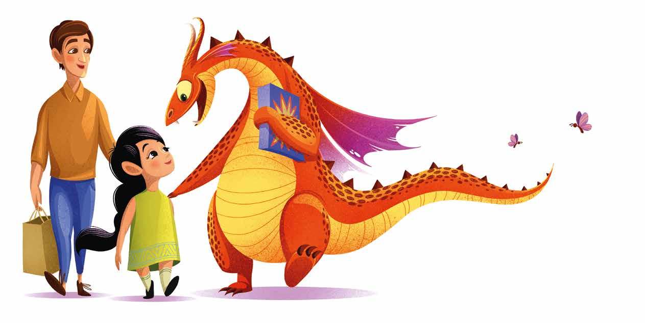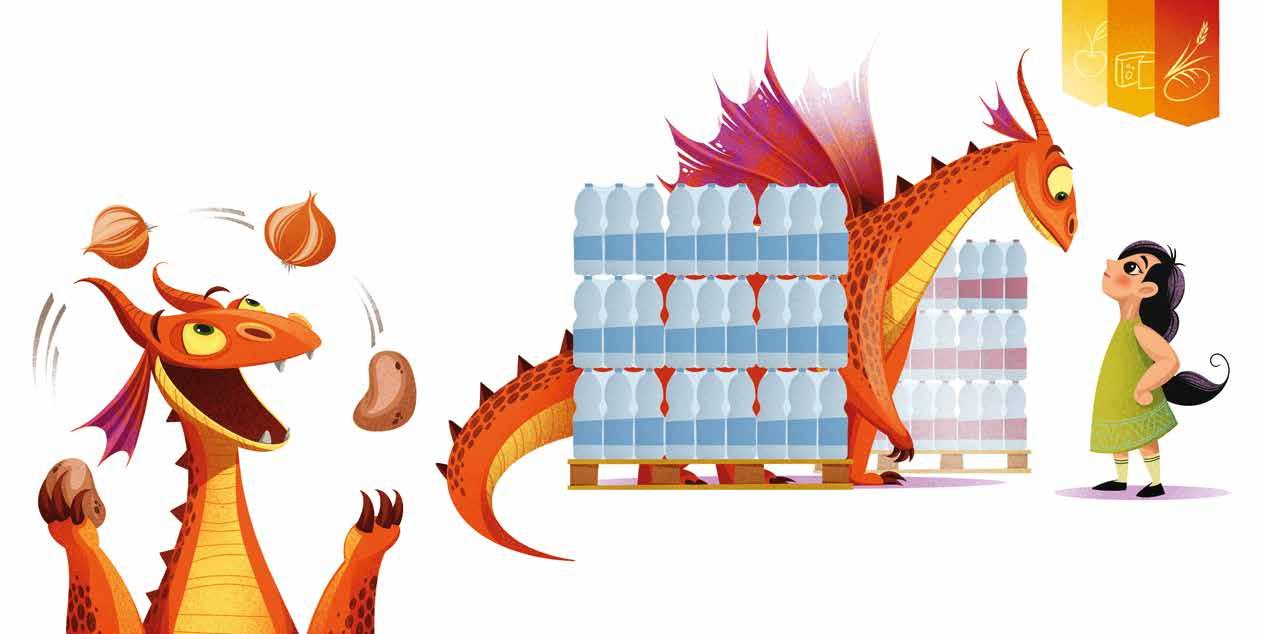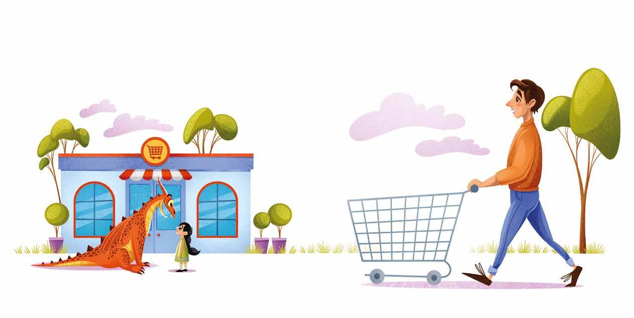 Baby Dragon stares the entrance of the supermarket mouth wide open. On his side, Lily smiles at him. In fact, in there it’s full of good things: fruit, vegetables, meat, fish, eggs… There are many shelves! And many people all over!
