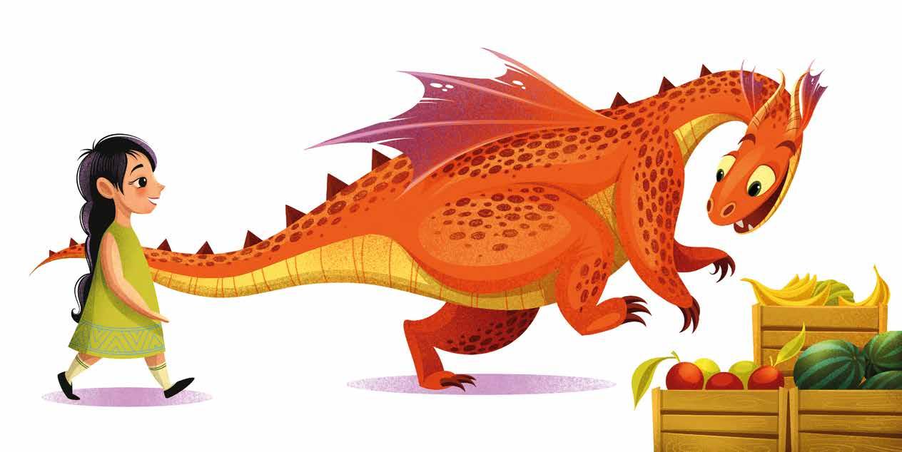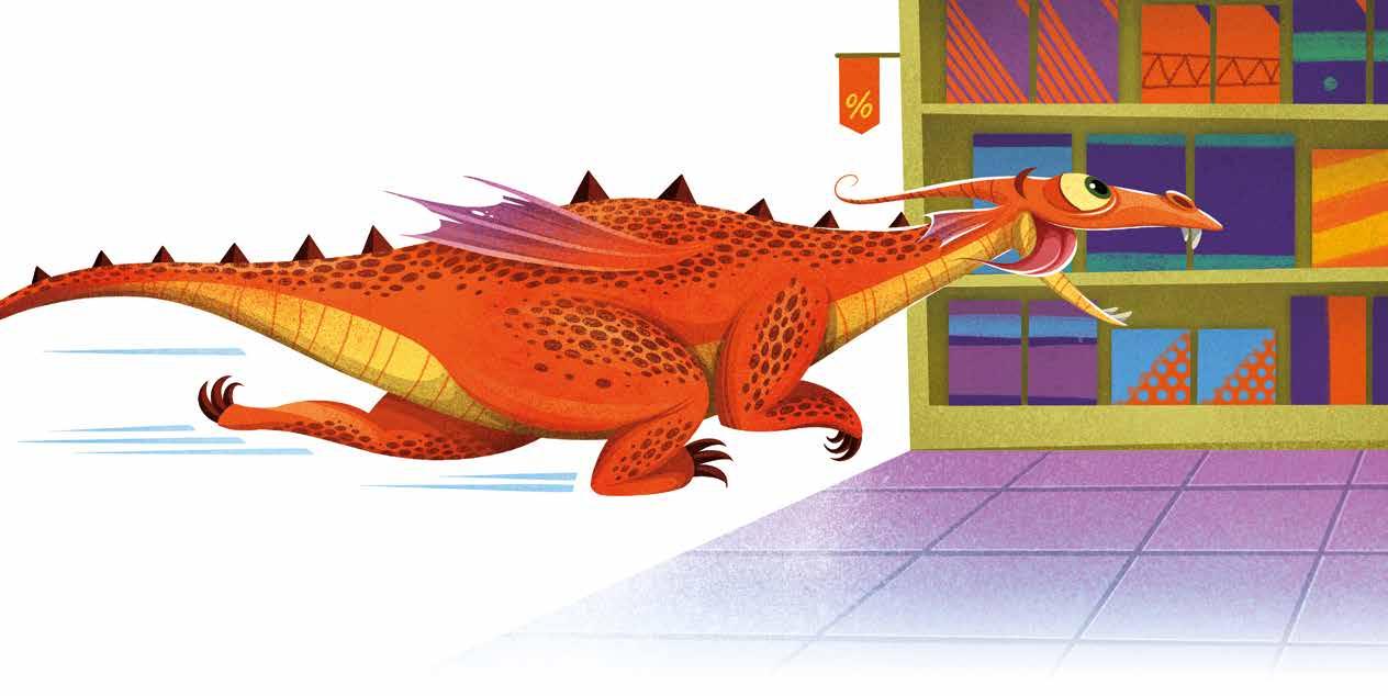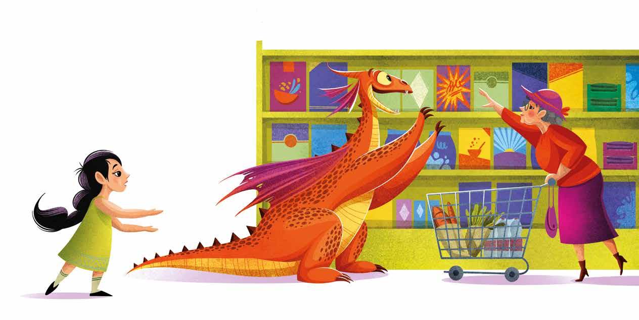 “The supermarket is an incredible place,” Baby Dragon says. Then, he dashes off like lighting and looks all over. He skips between the shelves, surrounded by many colors and different foods. He swishes between two carts!