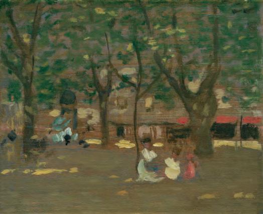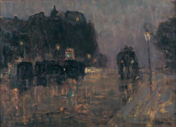 he observed as he sat in a public square or café, often with a liqueur to hand. He was attracted by tranquil scenes from a passing age – elegantly dressed women and men at leisure, horse-drawn vehicles, and garden squares, but never by signs of urban progress. The art critic Marius-Ary Leblond expressed it well: “One has the impression always that he is painting on a Sunday afternoon.” 5 The figures in his paintings often have an air of being alone, even when in the company of others (plates 9.3–5). At night Morrice became more gregarious and headed to one of the cafés where he knew he would find a group of friends.