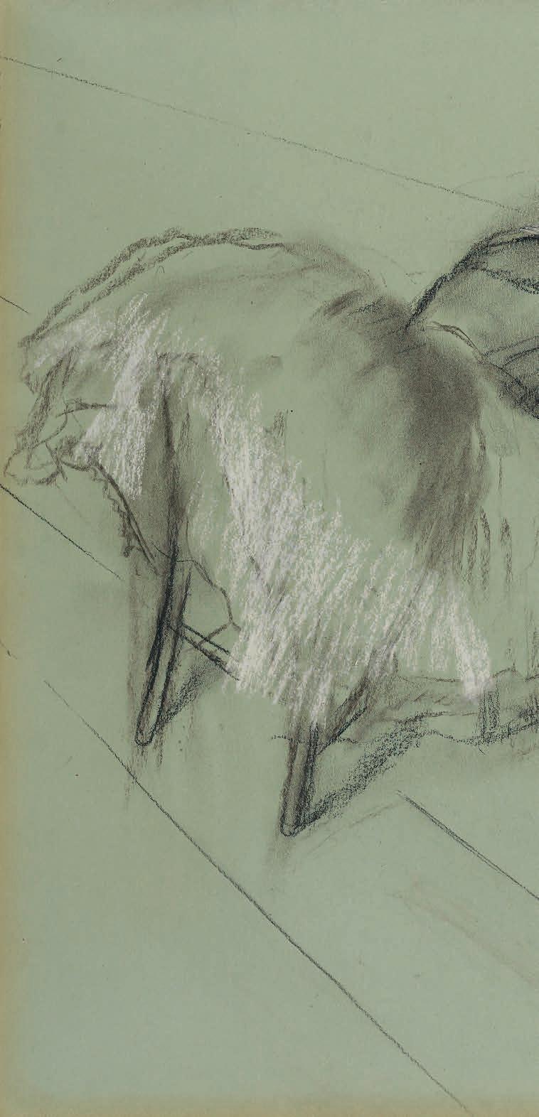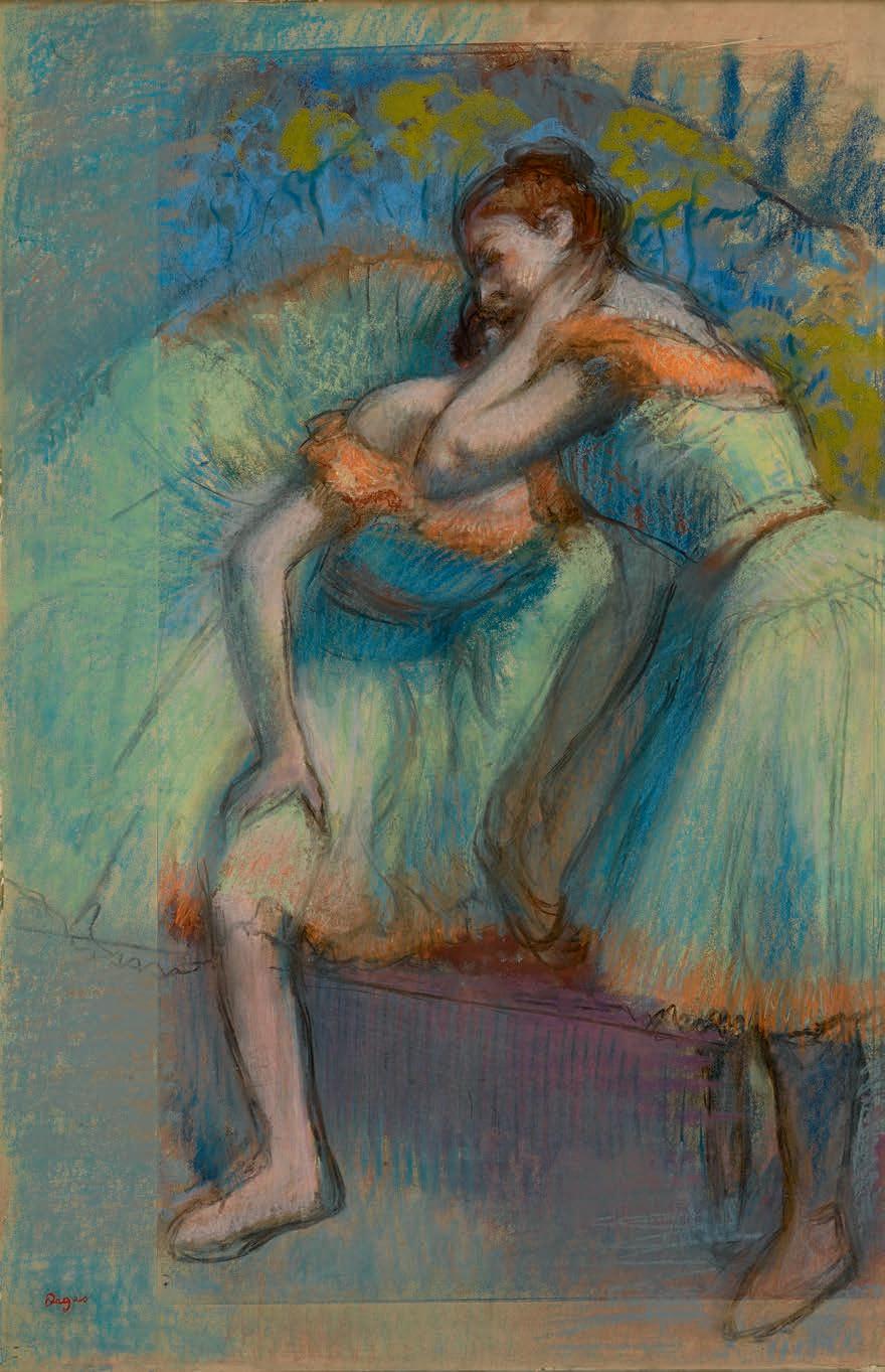 Edgar Degas, Dancer Yawning (Dancer Stretching) , 1873. Essence (diluted oil paint) on prepared green paperboard, 53 x 45 cm. Private collection