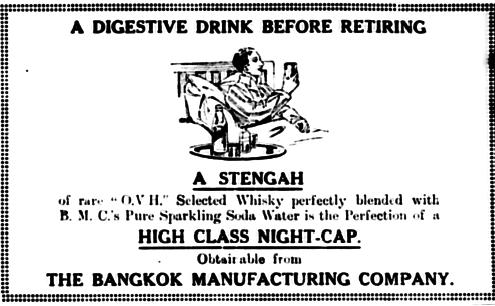 Visitors to Bangkok who expect to find the hectic scenes of vice and depravity sometimes described by novelists as the usual things of the East will be agreeably surprised at their absence, or chagrined as the case may be. But as elsewhere reasonable provision is made for all the wants of the stranger within the gates. Opportunities if wanted can be found for indulging in the night-out, binge, or jag, which even the oldest and steadiest-looking traveller sometimes feels himself entitled to.