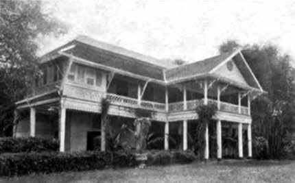 “No. 73,” accordingly, Harkness joined. The members consisted of Santall (already described), Garstin (of the Mines), and the lively little Frenchman, Jean-Marie Nempont, who lent a touch of sprightly colour alike to the Mess and to the Local Sanitary Board, to which he was more or less attached. These four men in the employ of the Siamese Government, and chosen for various reasons and various qualifications to “advise” a young nation in the way it should go towards the high ideals of European administrative methods, inhabited a large, wooden two-storey and very typical Bangkok house. A mass of pink and white Honolulu creeper did its best to cover and subdue the garish blue with which this edifice was painted; but apart from that, the house possessed compensations of convenience in its nearness to the business centre of the town and to the Clubs, and of airiness derived from a detached situation in a decent sized “compound.”